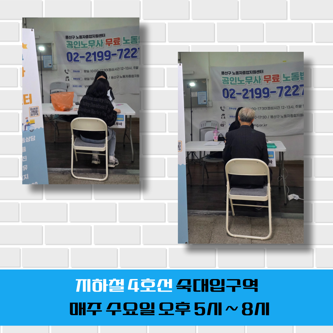 #임금체불 #퇴직금 #근로시간 #연차휴가 #해고 #징계 #산재보상 #직장내괴롭힘 #지하철 #4호선 #숙대입구역 #노동상담 #무료노동상담 #노동법률상담 #노무사 #공인노무사 #용산구노동자종합지원센터 #용산 #서울