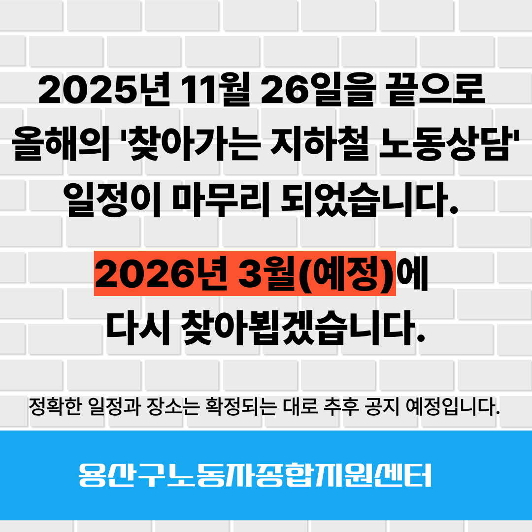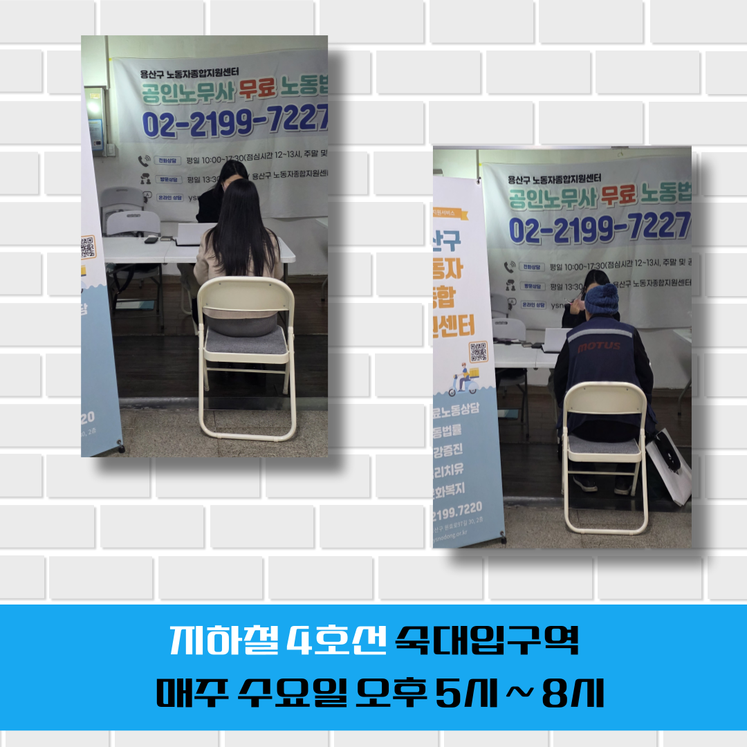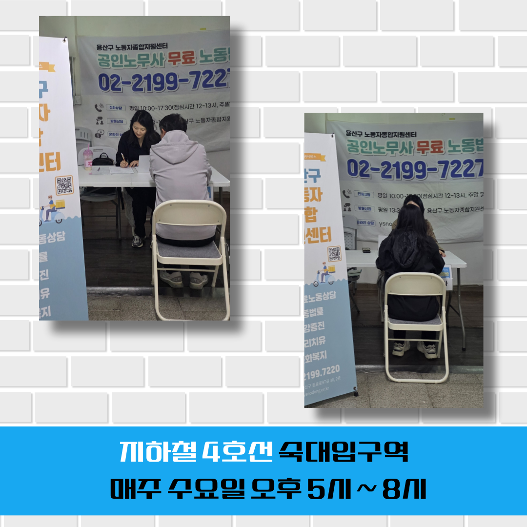 #임금체불 #퇴직금 #근로시간 #연차휴가 #해고 #징계 #산재보상 #직장내괴롭힘 #지하철 #4호선 #숙대입구역 #노동상담 #무료노동상담 #노동법률상담 #노무사 #공인노무사 #용산구노동자종합지원센터 #용산 #서울